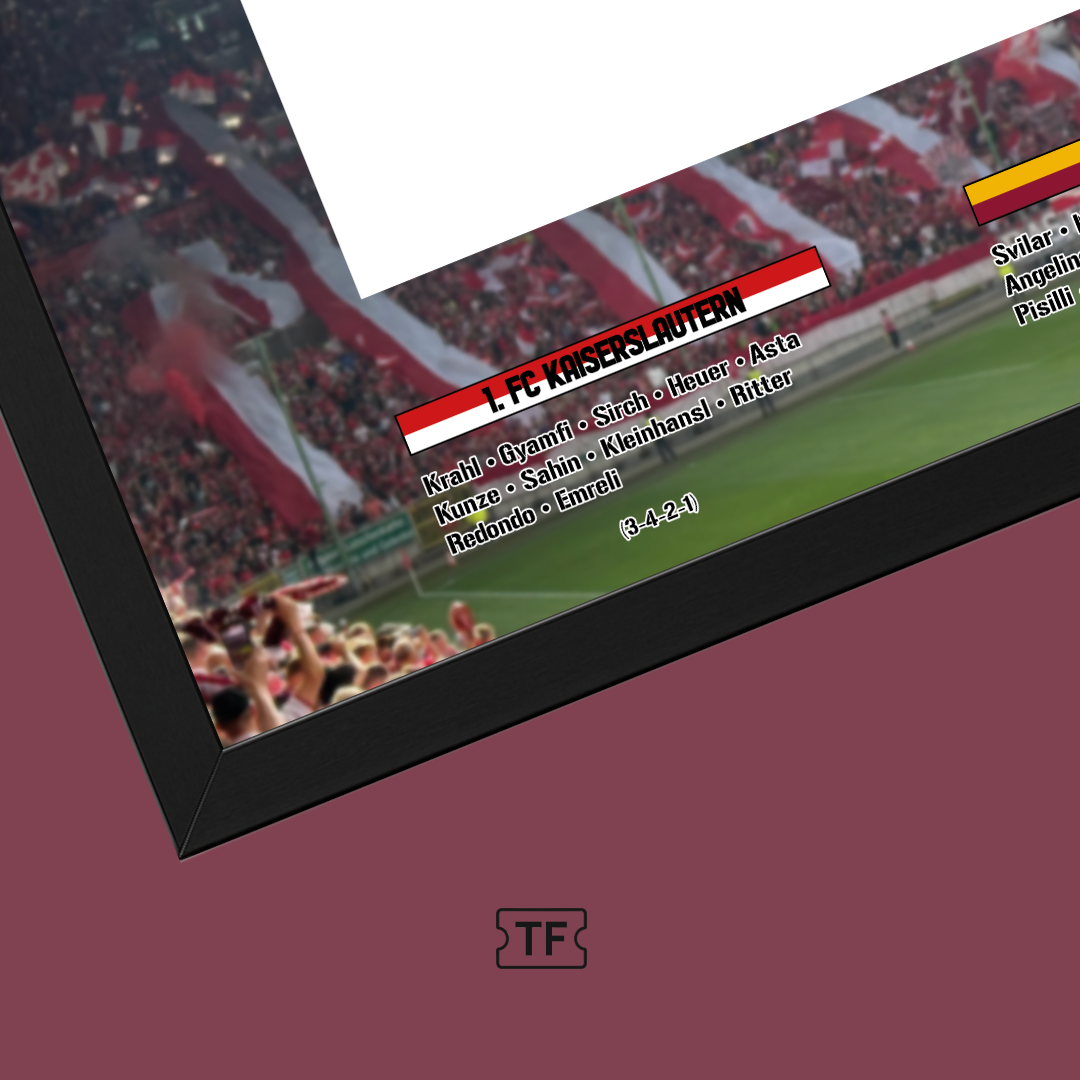 Ein Spiel für die Ewigkeit: Zum 125-jährigen Jubiläum des 1. FC Kaiserslautern erinnert dieser einzigartige Frame an das legendäre Duell gegen den AS Rom. Historische Momente, pure Emotionen und ein Design, das Tradition und Gänsehaut vereint. Dein persönliches Stück FCK-Geschichte – handgefertigt, mit Liebe zum Detail gestaltet und bereit für deinen Ehrenplatz.